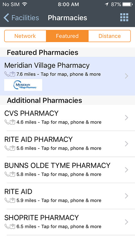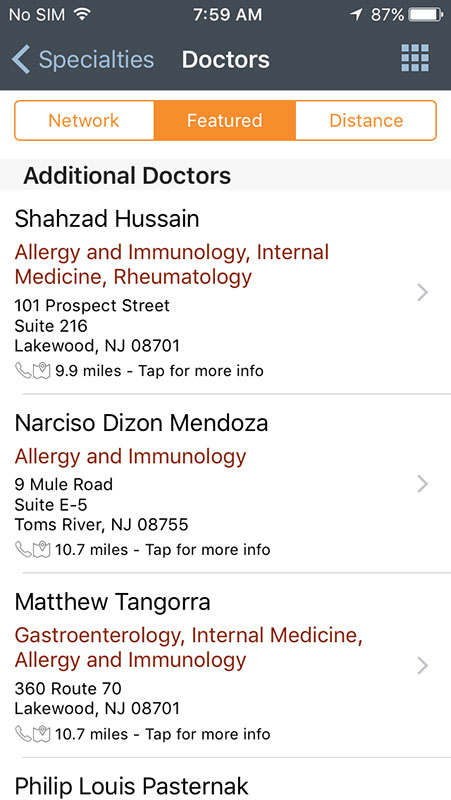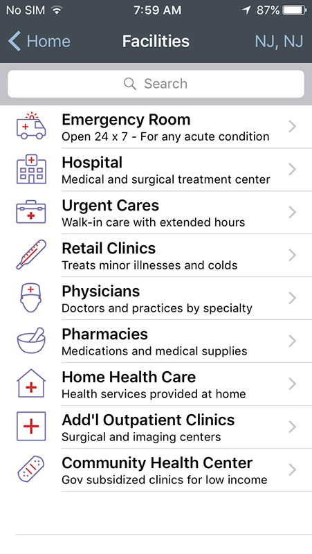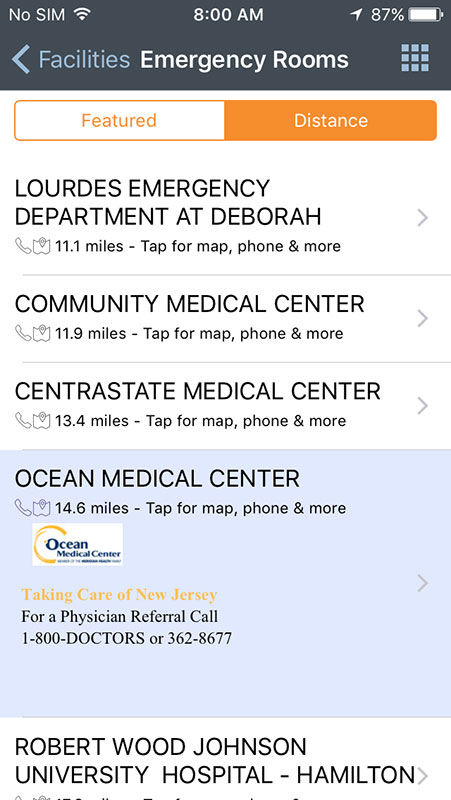 Another great thing about the iTriage app is the use of phone's GPS and map to help you find physicians and facilities, including hospitals, ERs, urgent cares, or pharmacies near you. You'll get the list with the names of physicians or facilities along with the distance in miles. Tapping on any name will allow you to make a call or to get the map and directions. Facilities and doctors can be saved and accessed later via MyiTriage option, which requires registration with the app.