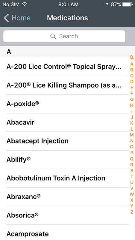 Beside Conditions category, the medical information is also provided in Medications and Procedures categories, which all feature the alphabetical list in the same way as the list of symptoms. They're also arranged in a similar way as Condition pages. Symptoms, conditions and medications categories are interlinked, and can be access via one or another.