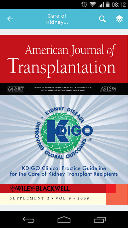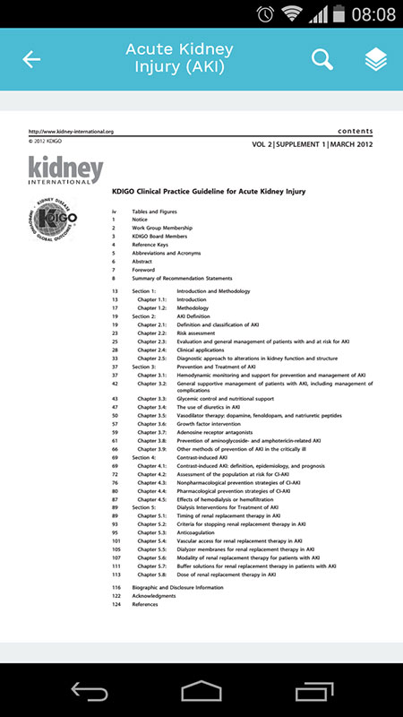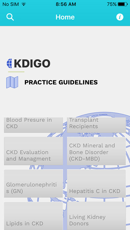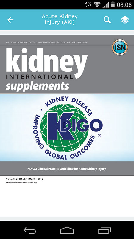 The KDIGO app was initially released in 2013, allowing clinicians to access 9 clinical practice guidelines in a fully searchable format, as well as related materials, reports, and papers. It also offered features such as notation, highlighting, and bookmarks that allowed easy personalization.
