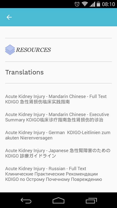 The app opens up to a Home screen including only practical guidelines. Users can't anymore access digital resources, or the online community, like was the case in previous version. There are 9 guidelines covering various nephrology topics, from acute kidney injury, blood pressure or Hepatitis C in CKD, to care of kidney transplant recipients.