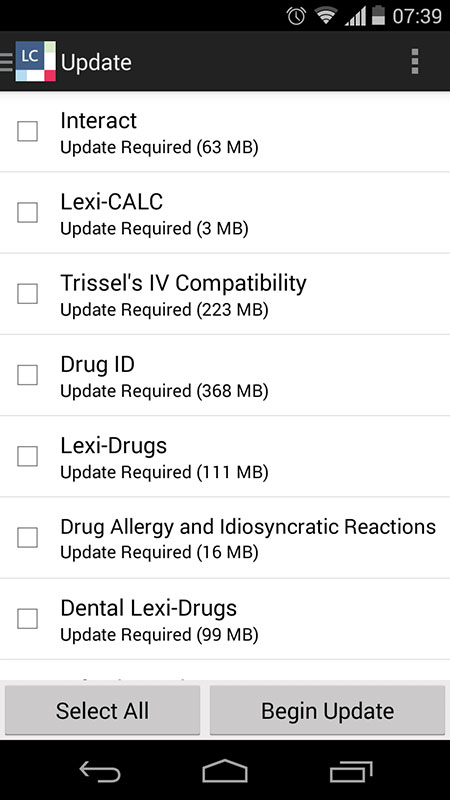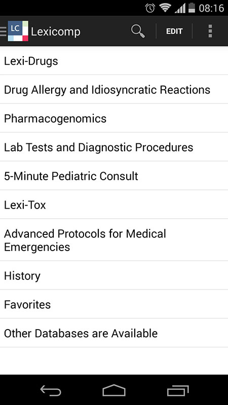 On the first launch of Lexicomp, you'll be offered to download databases (individual or all) from the list of 37 medical and dental categories, which include detailed pharmacology reference guides, Drug ID, pharmacogenomics, toxicology, labs and diagnostics, calculators, 5-Minute Clinical Consult, medical abbreviations, advanced emergency protocols, etc.
