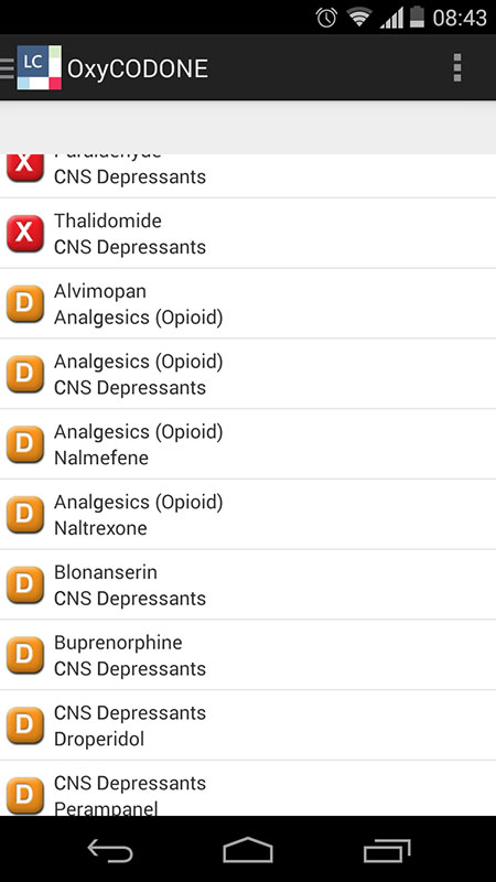 It's possible to check various drug interactions within the drug database. However, Interact category on the main screen allows you to do the same i.e. to search for drug interactions between two or more medications. Simply tap on Add button and after choosing the medications, you'll see the list with color-coded icons that indicate risk rating.