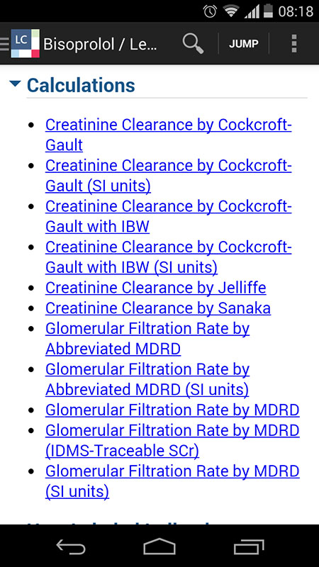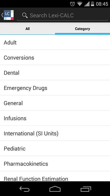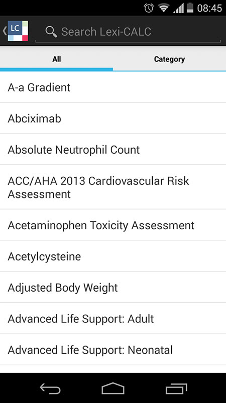 Lexicomp also includes various medical calculators, from A-a Gradient to 4T score, which are sorted alphabetically and by category. This way it works well as a decision support tool too.