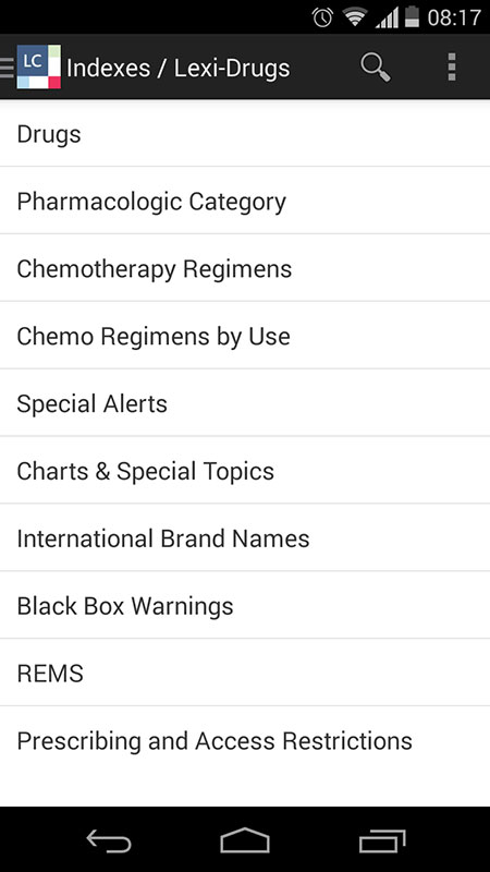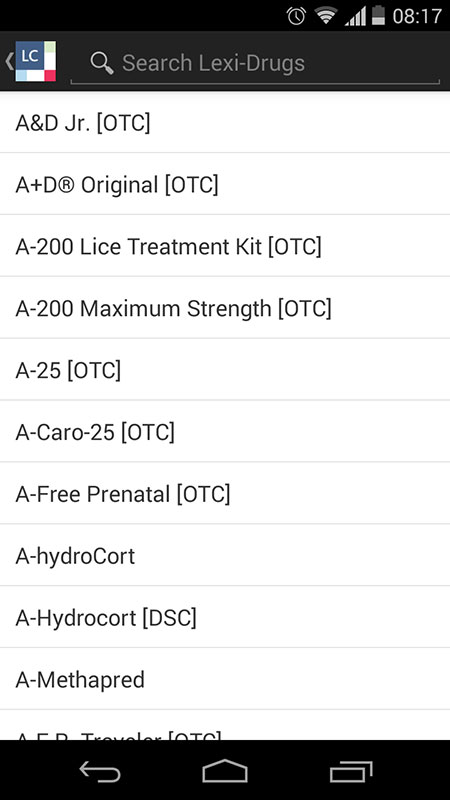 To see the scope Lexicomp app covers, simply tap on the drugs category. It will take you to the endless list containing any known medication, sorted in alphabetical order.