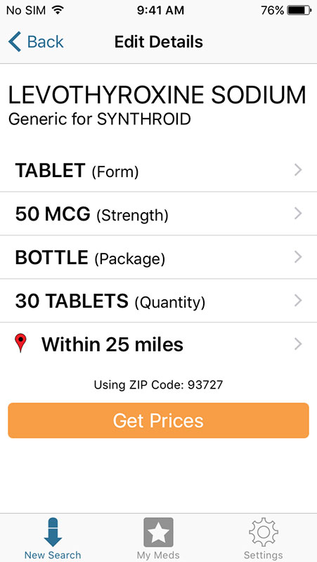 There is an orange button at the top of the list that you can tap on and change drug details, such as form, strength, package, quantity, and distance (search radius in miles). To change these details, consult your instructions on the prescription, or your pharmacist.