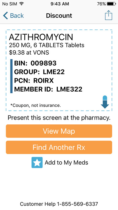 LowestMed app also offers discount coupons you can use at your local pharmacies. Tap on 'Get Coupon' button next to the drug name in the list and the app would display your savings card you can present at the pharmacy to get a discount. You don't have to print the card, just show the phone screen to the pharmacist.