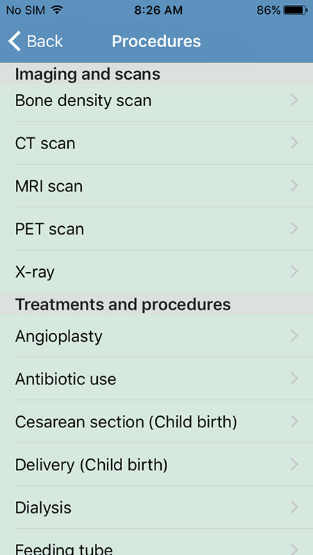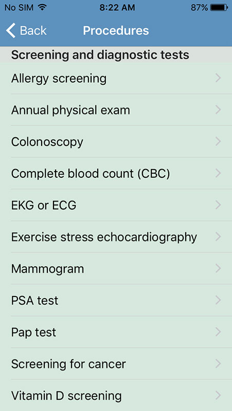 Procedures and test are featured as simple list with items grouped in three more sections that include Screening and diagnostic tests, Imaging and scans, and Treatments and procedures.