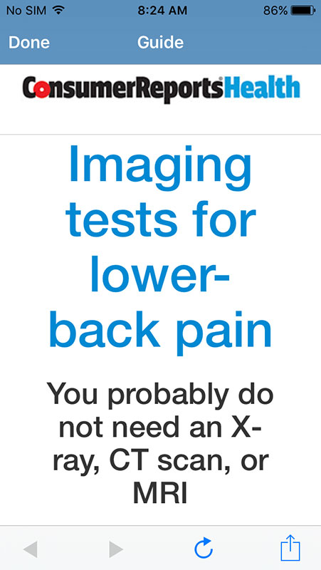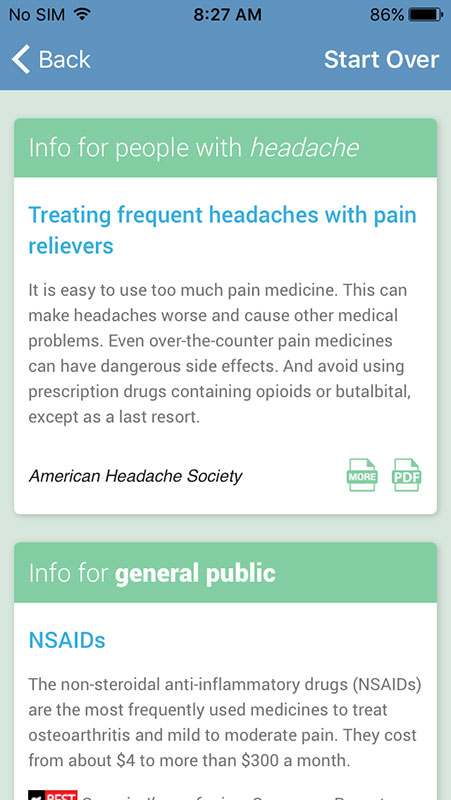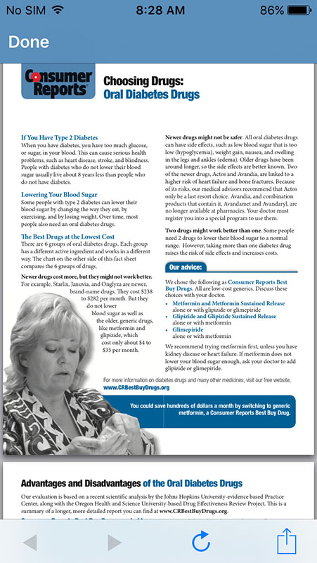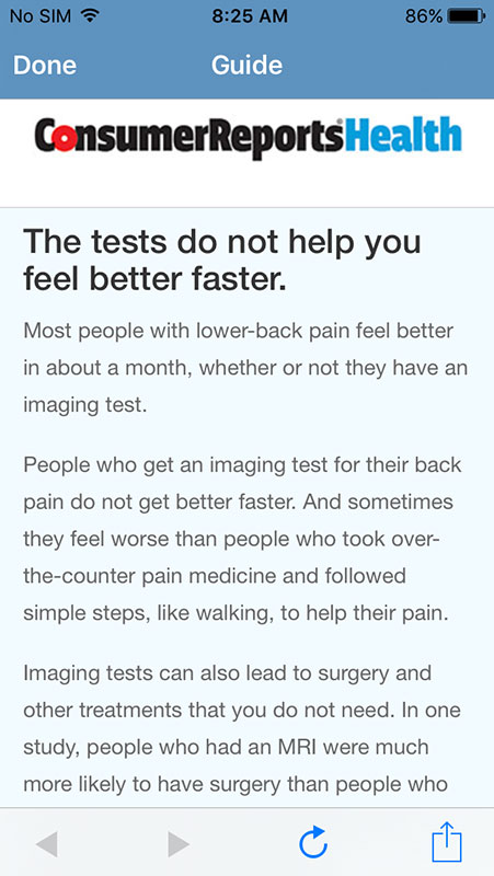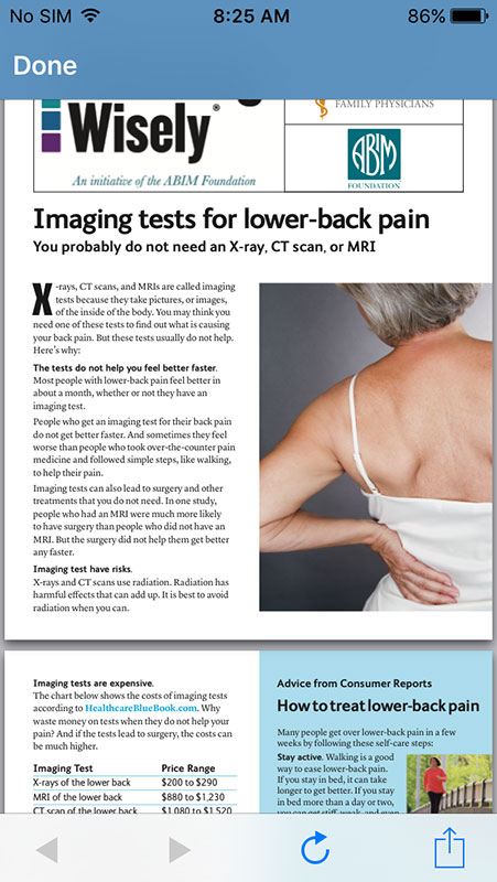 Tapping on any entry would open new screen with relevant information provided in a form of small info sheets or boxes (single or multiple, depending on the topic). Each box contains brief piece of information or recommendation, with the name of the resource used, and link to more detailed information on Consumer Reports Health website, which is also available as PDF (both open within the app).