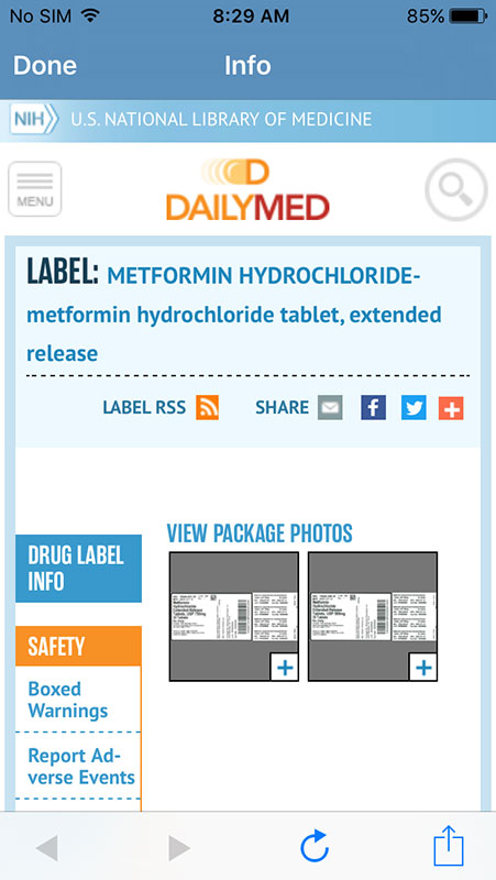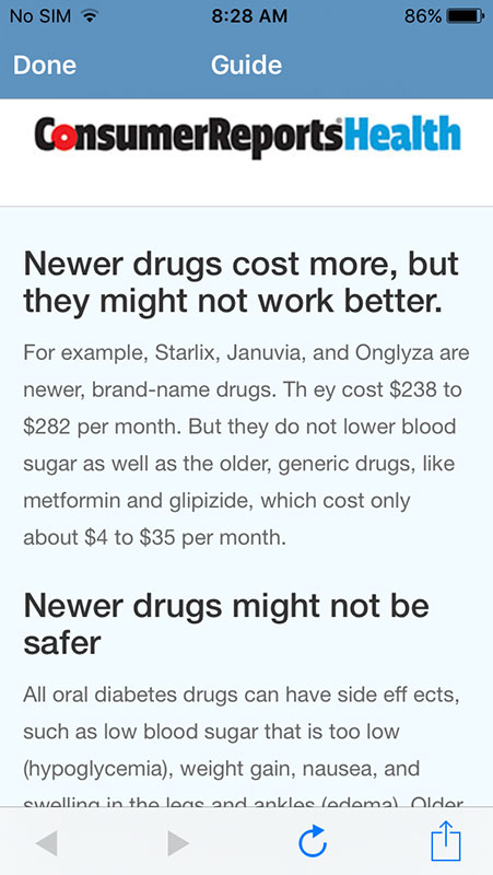 Information about medications is provided in same fashion, i.e. via info boxes that provide brief information, with link to detailed Consumer Reports recommendations. Also, users can learn more about the drugs on Medline Plus website, as well as FDA approved formulations with drug labels and images.