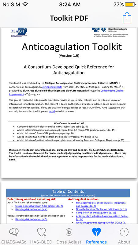 Reference tab opens Anticoagulation Toolkit PDF file, which provides more useful information, especially about various risk models, FDA approved anticoagulants and their comparison, choice of anticoagulant based on patient's characteristics, identifying patients appropriate for TSOAC therapy, etc.