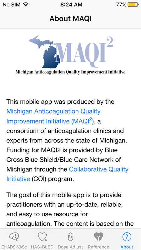 Fortunately, the University of Michigan developed a handy app called MAQI2 Anticoagulation Toolkit, which purpose is to help you answer those questions and simplify the decision-making process.