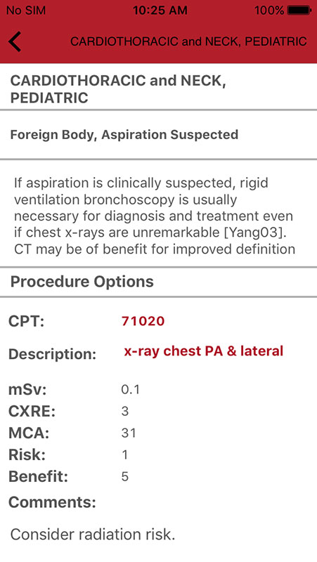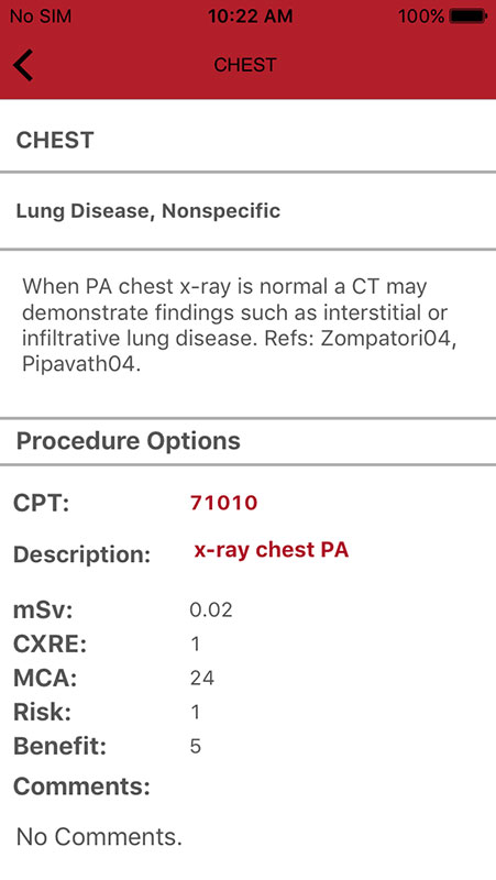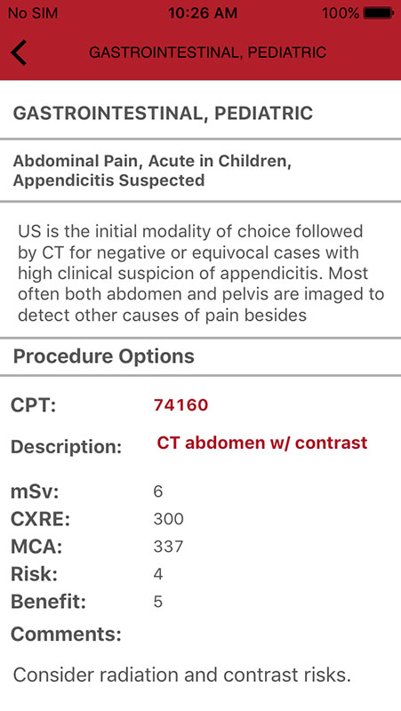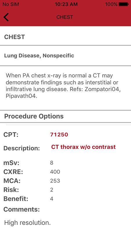 For most suggested procedures, the Medical Imaging Consultant app displays the CPT code, description, radiation dose in mSv, chest X-ray equivalents (CXRE), MCA, as well as a risk and benefit score for each imaging option, giving physicians an informed basis for making a right selection.