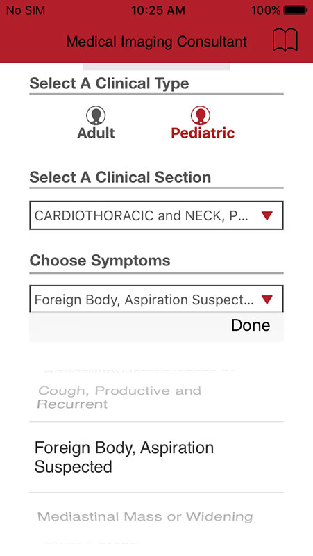 Medical Imaging Consultant app provides imaging recommendations for both adult and pediatric patients, grouped in two separate sections.
