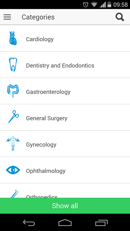 The MEDtube app's home screen offers a list of various medical specialties, listed alphabetically starting with Cardiology and apparently finishing with Pulmology section, which was awkwardly covered with Show All button, that's supposed to show all categories at once. It does show them, but only briefly, because in a second you're redirected to particular category, which apparently holds the same position as the Show All button. This was another annoyance with this app that we didn't expect to see this soon. But this bug seriously ruins the user experience, because once you tap on Show All button, you can't choose the specialty listed afterwards, yet you'll be repeatedly redirected to Cardiology, Clinical Genetics or Clinical Oncology, three categories that hold the same position as the button, depending where your scroll was on the previous page.