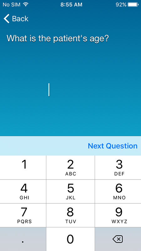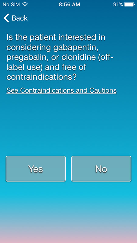 Going through the questions is simple and doesn't take more than a couple of minutes. At each question, the app also provides recommendations with links, particularly for questions about medications, which include dosing information, potential side effects, drug interactions, and so on. The app also includes hand-outs on different topics that open within the app and that can be emailed to patients or printed.
