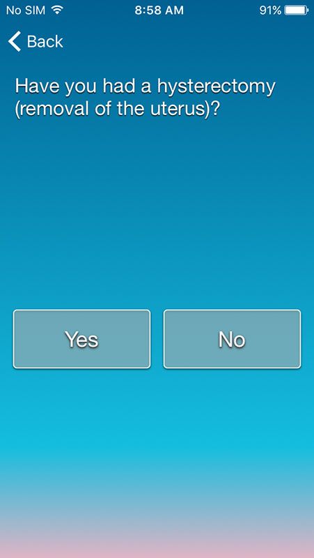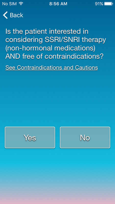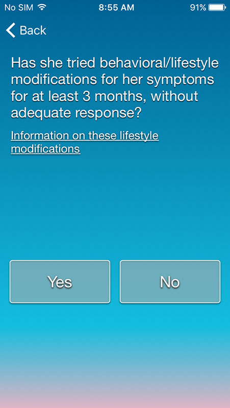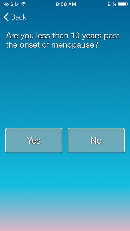 The app is easy to use with a clean and intuitive interface. Upon the launch, it will ask you if you are a provider or patient. The questions are constructed in more or less similar fashion, asking both patients and professionals to provide various demographic information, including age, prior behavioral/lifestyle modifications (at least 3 months), duration of menopause, health conditions, interest in hormonal treatment and non-hormonal medications along with indications, and so on.