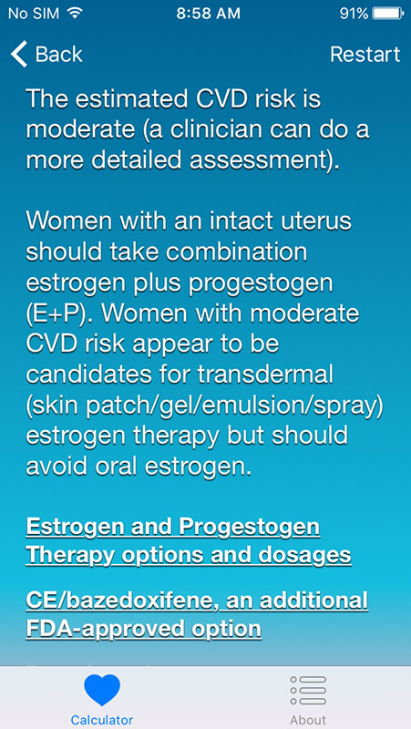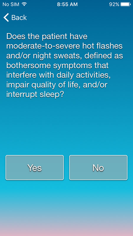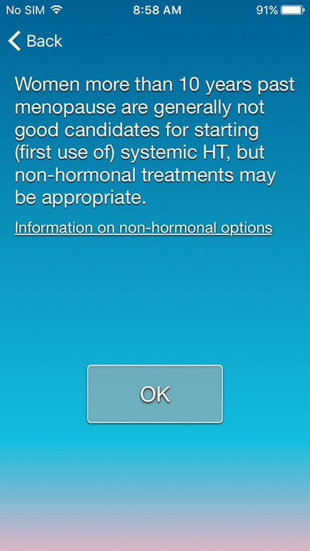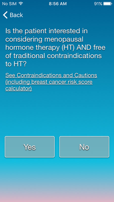For example, if a patient is interested in hormonal treatment, the app will calculate an AHA/ACC ASCVD score. If the risk is >10%, the app would recommend patients to consider non-hormonal options, because the risk makes them a not good candidate for HT.
