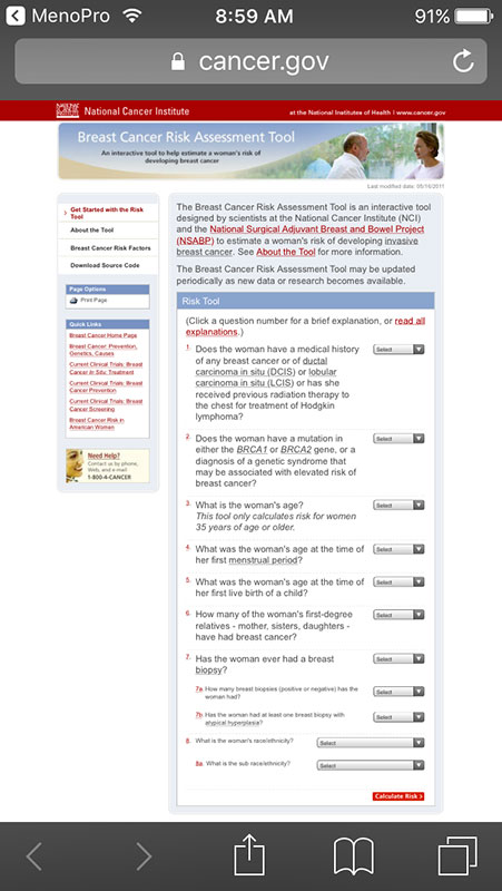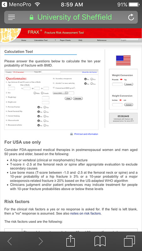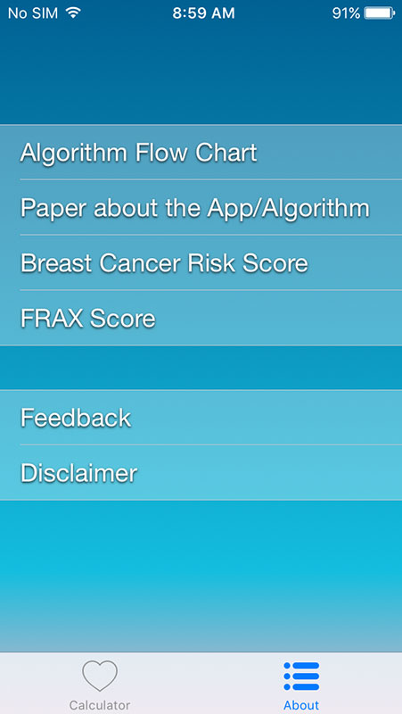 Besides questionnaire/calculator part, the app also has an "About" section that includes some useful information for both providers and patients, including a PDF of the complete algorithm that the calculator section of the app is based on, and an overview document about how the app was developed and how to use it at the point of care. This section also includes two risk assessment tools, one for breast cancer and FRAX for fractures that both lead to outside sources that can be viewed inside the app (at least on iPhone).