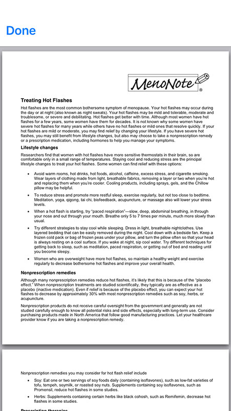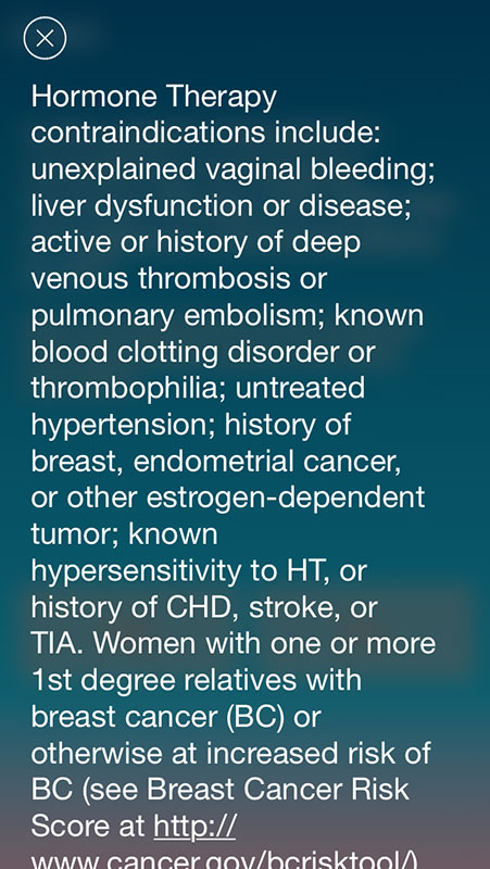 This part of the app, in my opinion, isn't optimized for patients and may confuse them, because it provides quite technical information, particularly about various drugs that many patients may be unfamiliar with. But, since the developers stated that patients should use MenoPro app only while working together with their medical providers, this isn't a big objection.