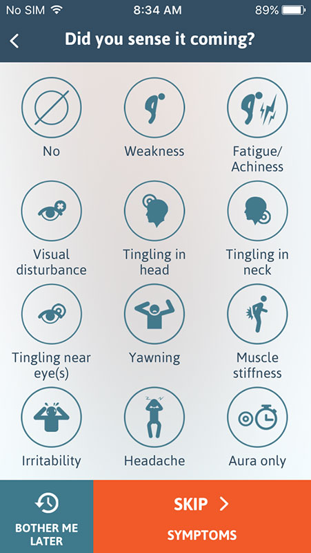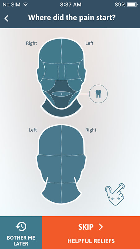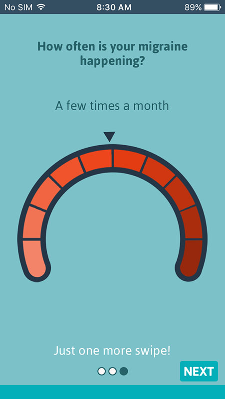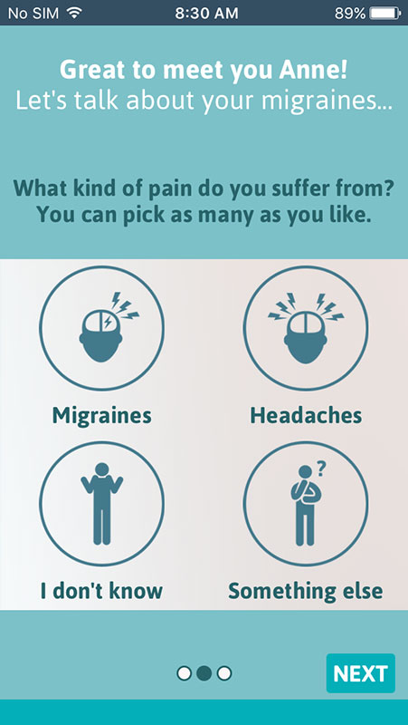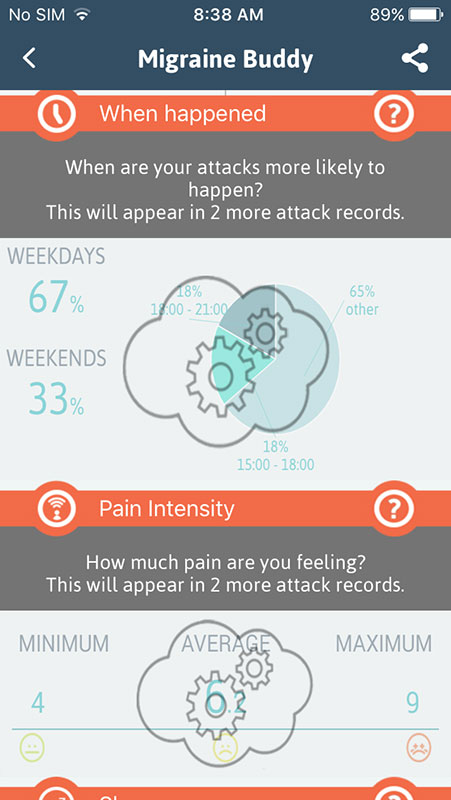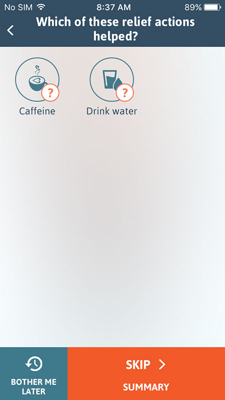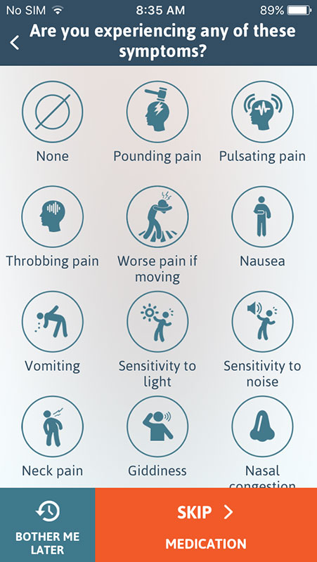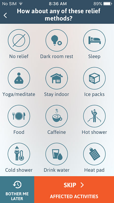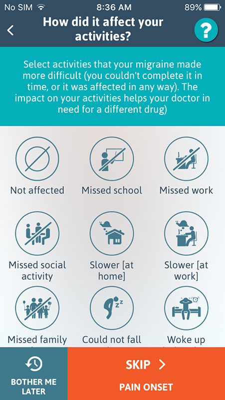 Users will be asked if they're having menstrual cycle (if they're women), if they've sensed aura or other signs that precede the attack, what symptoms they've experienced, if they've used medications or other relief methods (and which relief method may have helped), how migraine affected their life activities (and which), and finally to describe where did the pain start by tapping on illustrations of the head (front and back) divided into sections.
