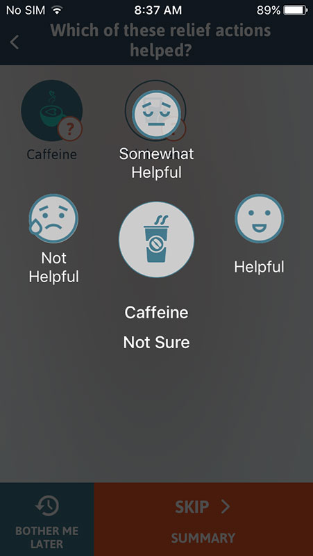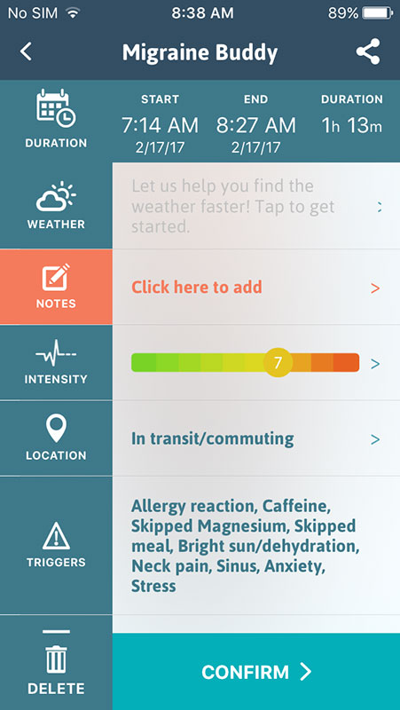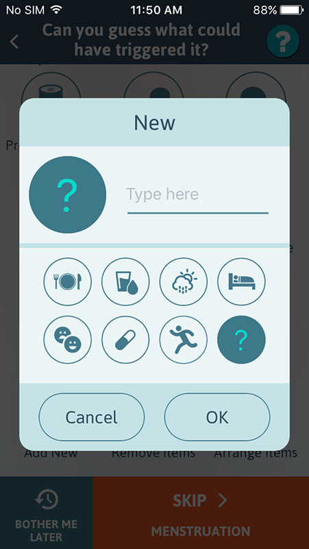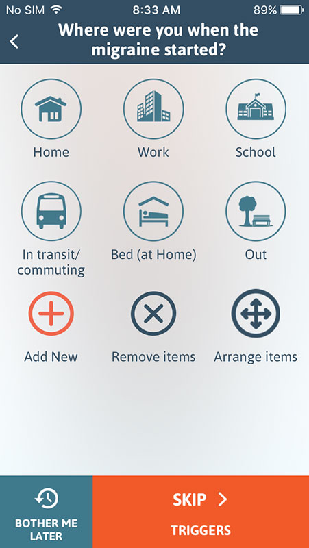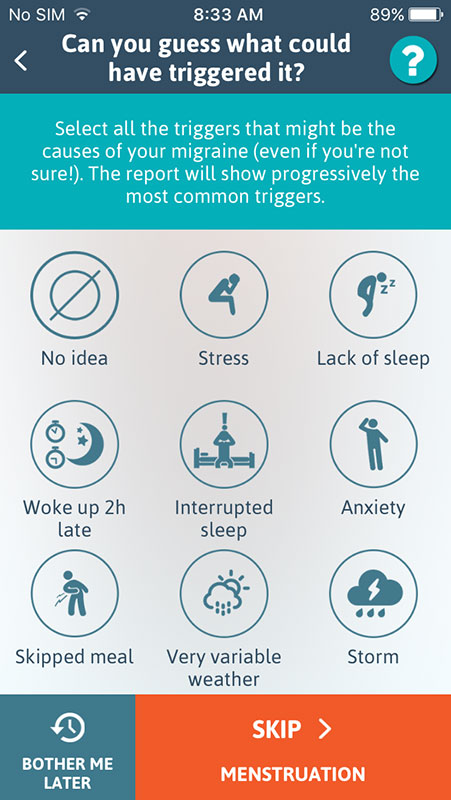 Migraine sufferers will be also asked if they can guess what might have triggered the attack bu choosing from the list of preset triggers, including stress, lack of sleep, anxiety, skipped meal, or users can simply add their own trigger.
