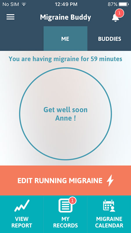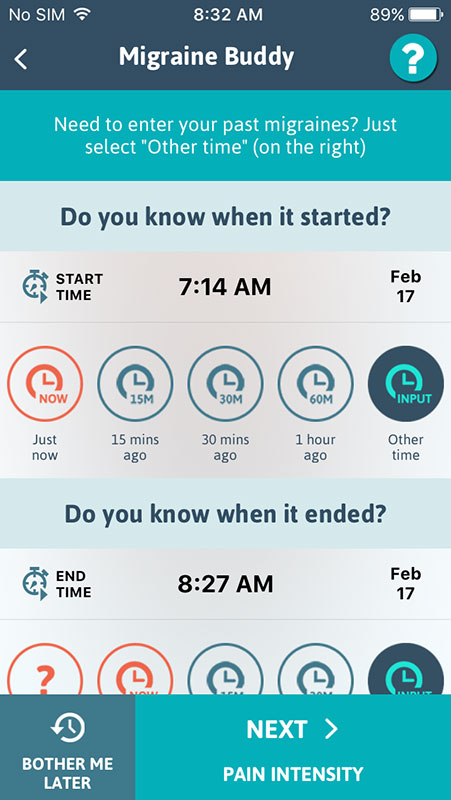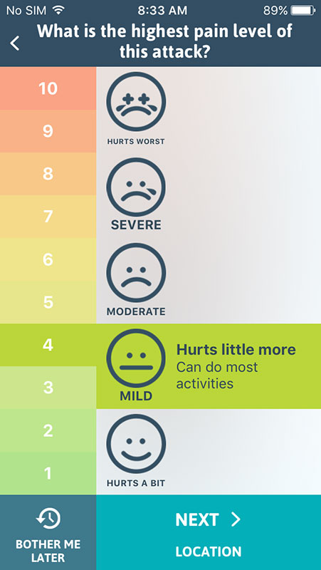 After registration, the app will prompt you to start recording a migraine. This part is very simple to use and follow, because the app will guide you through every step.