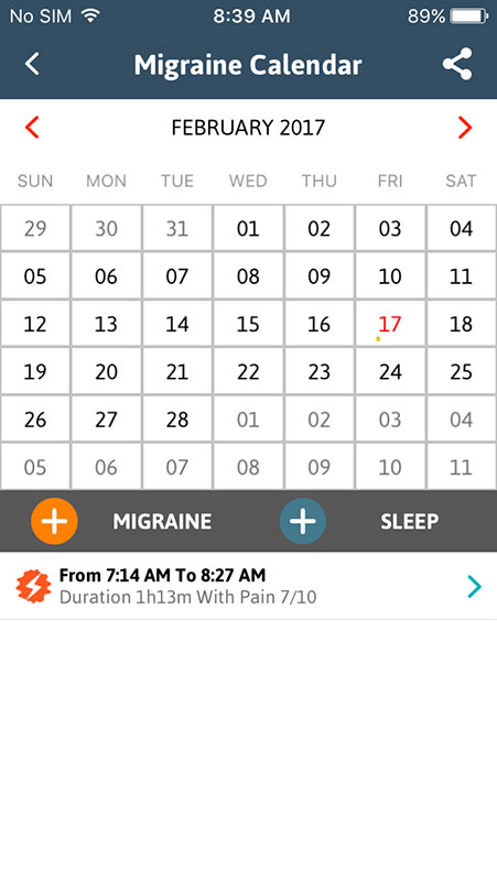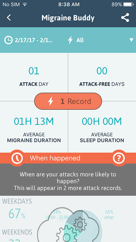 The users will be then taken to the home screen that features a large circle reporting how many hours or days it has been since the last migraine attack, which users can share with others via Facebook.