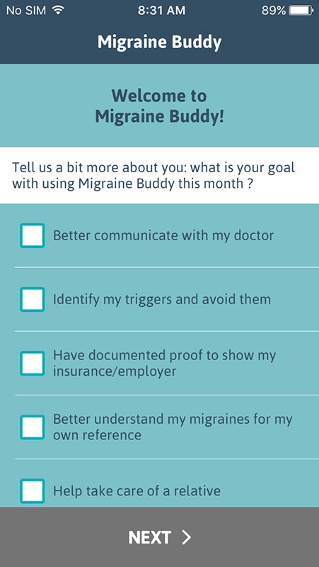 Migraine Buddy app requires users to create an account by providing some basic information about them, including name (only your first name), sex, email address, as well as type and frequency of pain. Users also have to answer what is their goal, i.e. what they expect from Migraine Buddy app.