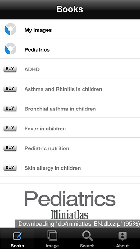 The main page titled Books is pretty simple. It features a list including various topics. There are My Images and Pediatrics sections available, while others such as ADHD, Fever in Children, Pediatric Nutrition, and others are 'grayed out' with 'Buy' button next to it.