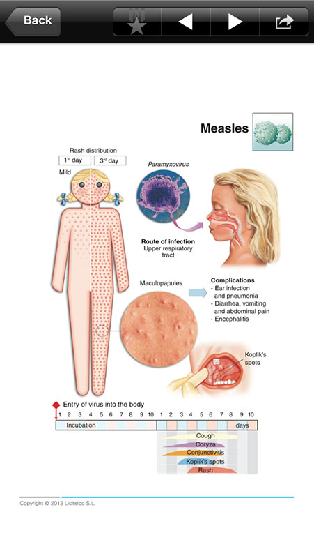 For example, the image of measles shows how the virus that causes the disease looks like, route of infection, specific signs and symptoms, such as Koplik's spots, rash distribution, complications, etc.