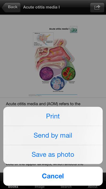 The app allows users to print each topic and image, or to save it on their device or share it via email. However, there's no option to save the content in the app, i.e. add it to Favorites, so I couldn't figure out the purpose of My Images section. It will always be empty due to the lack of ability to add images.