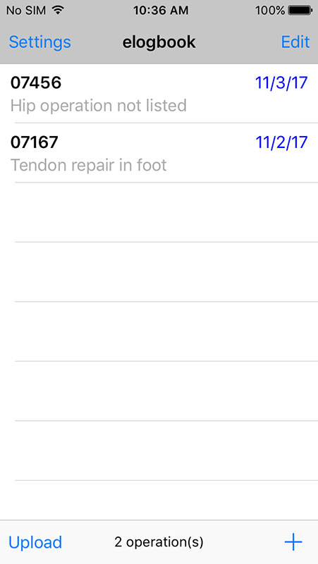 All the operations recorded will be visible on the main page with patient ID, date, and type of surgery listed. If you tap on Upload, they would disappear once you have the Internet access. That's right.