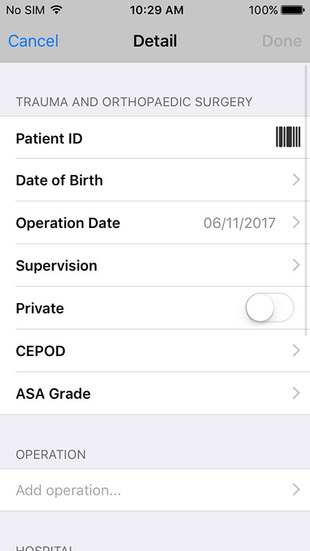 The app's main page is empty. You can enter data simply by tapping on the plus symbol and then add entries including Patient ID and DoB, date of operation, urgency and type of the operation, your role, ASA grade, etc.