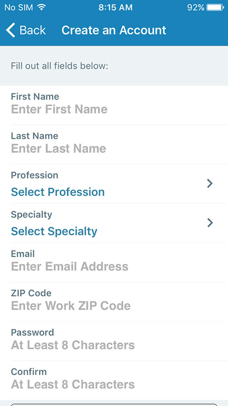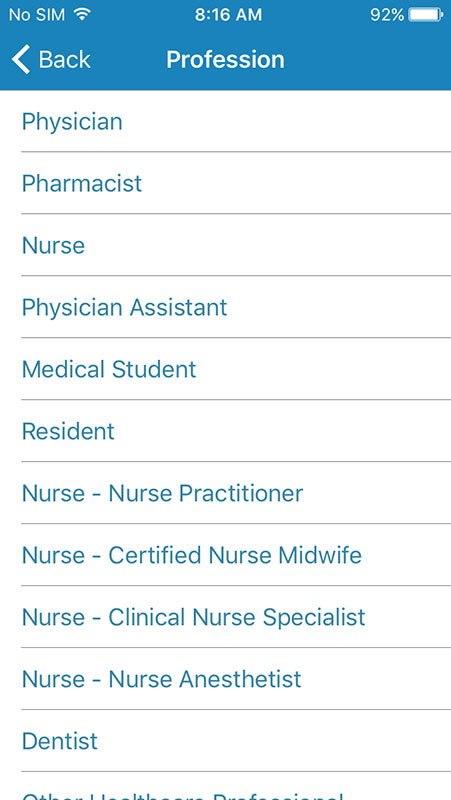 The app requires users to register an account by providing some basic info, including their profession and specialty. While it can be downloaded for free by anyone, the app is intended for use by U.S. healthcare professionals.
