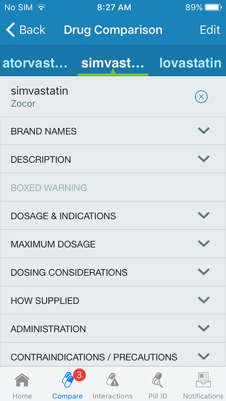 Next useful feature of mobilePDR app is ability to compare different medications (up to 8 different drugs). You can simply add medications you want to compare, and they would be listed in side-by-side tabs you can switch by tapping on them or swiping left-right to compare dosing, indications, side effects and other information.