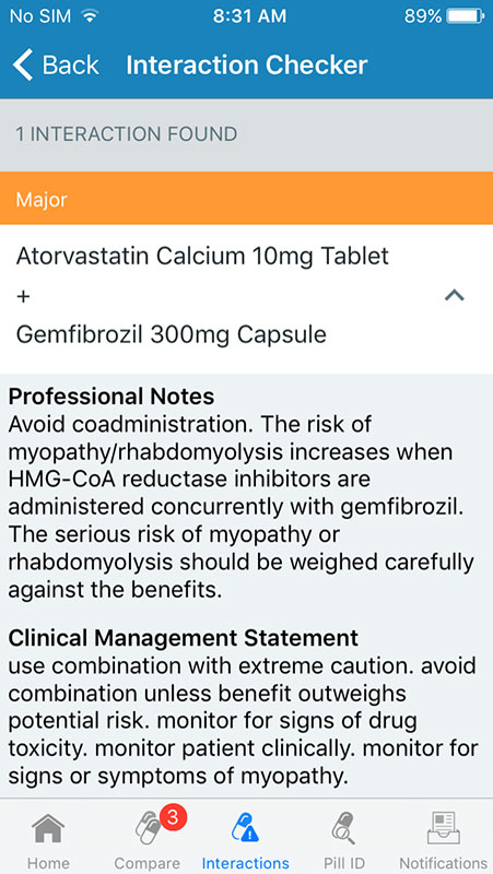 For the purpose of this review, I wanted to check if Gemfibrozil that patient is using for high cholesterol interacts with Atorvastatin therapy. I got an indication that there's major interaction between these drugs, since there's increased risk of myopathy or rhabdomyolysis.