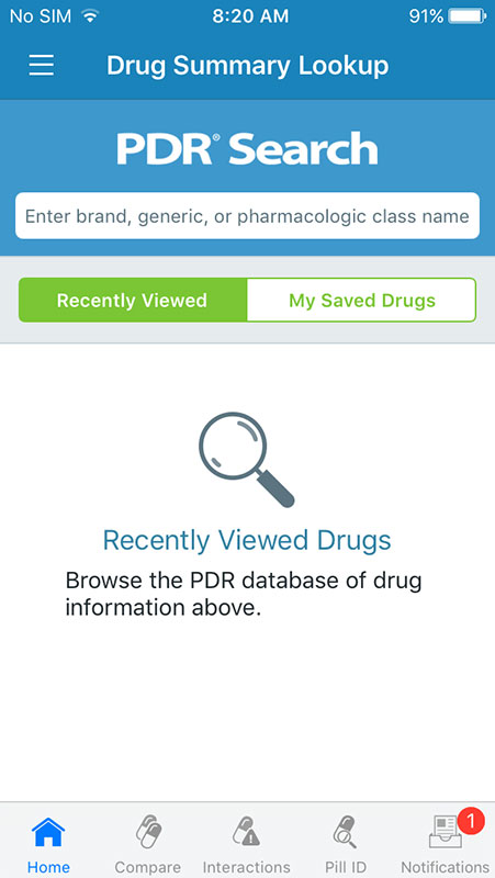 mobilePDR app opens to the main screen where users can utilize the search tool to quickly find the relevant details about the particular medication. Users can search by brand or generic name, or even pharmacologic class. After the first search the main screen will start to populate with recent searches, and saved searches in another tab, which makes the access a lot easier.