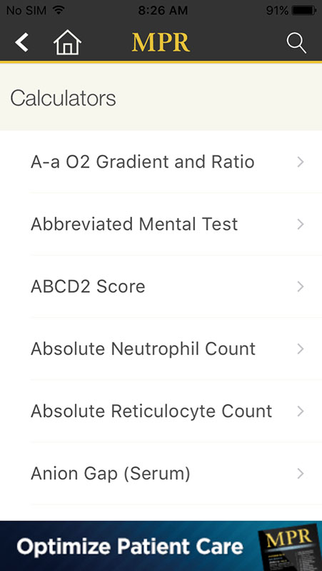 Monthly Prescribing Reference app also features more than 120 clinical calculators, listed alphabetically from A-a O2 Gradient and Ration to WFNS SAH Grade. Most calculators contain references and formula, however, some don't. Also, calculators don't provide additional explanations, for example about scores in CHADS2 calculator.