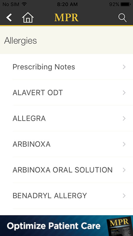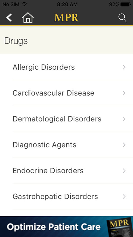 The most important feature of MPR app is drugs database that contains more than 4,300 prescription and OTC medications, organized by therapeutic area and health conditions, from allergic disorders to endocrine disorders to urologic disorders.