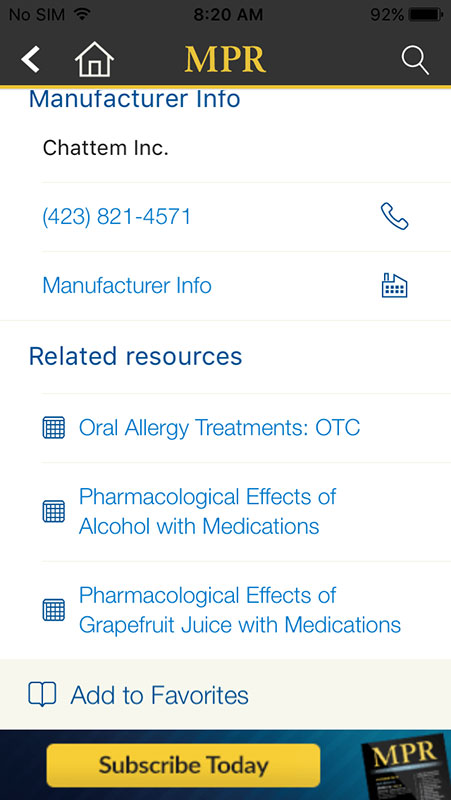 Drug monographs contain concise information regarding medication class, indications, and dosing for adult and children patients, contraindications, warnings/precautions, interactions, adverse reactions, how it's supplied, generic availability, manufacturer info including address, phone number, website, and all other drugs made by the company. Users can add monographs to Favorites and access them later in Favorites section.