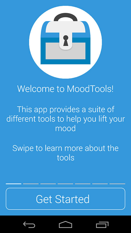 As said, the MoodTools app is primarily designed as a self-help tool, but it can also be used as a supplement to treatment. Upon opening the app, you'll be taken through the short tour that explains the main features and how the app works, after which you'll get to the main screen.