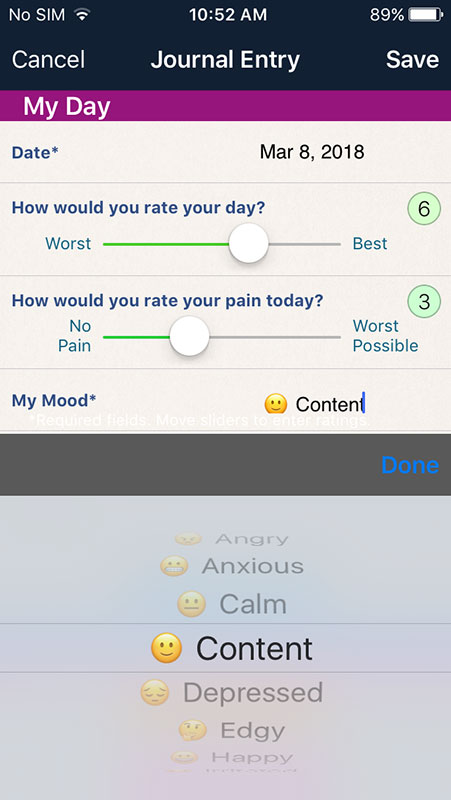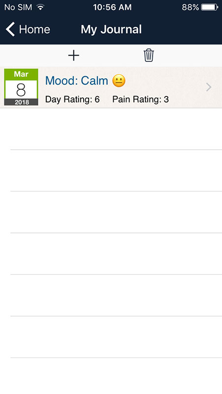 The app allows users to keep their daily journal to log and monitor their mood, pain levels, ability to keep social plans and well-being and to track symptoms and activity.