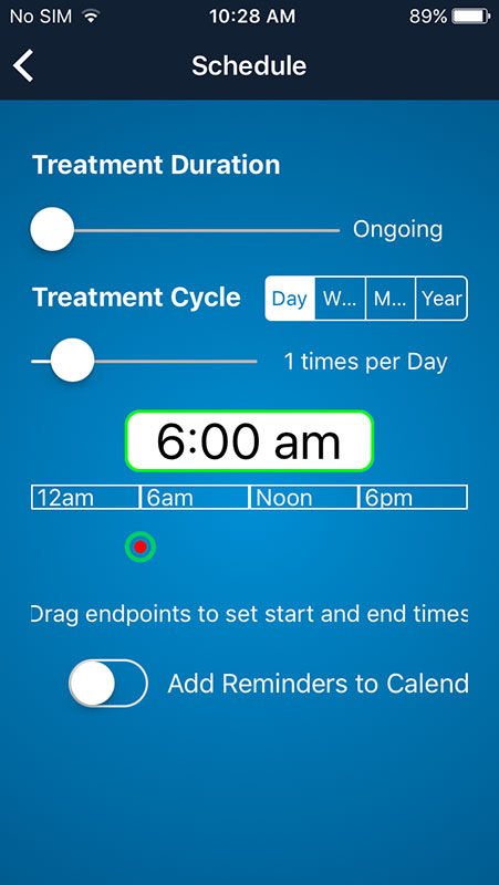 You can set the treatment duration and cycle, i.e. how often you take it. It can be As needed, or as prescribed. Here you can set the time and add a reminder to the calendar. While I was reviewing the app, reminder didn't work when I was outside the app, doing other things on my phone, but it worked when I was using the app.