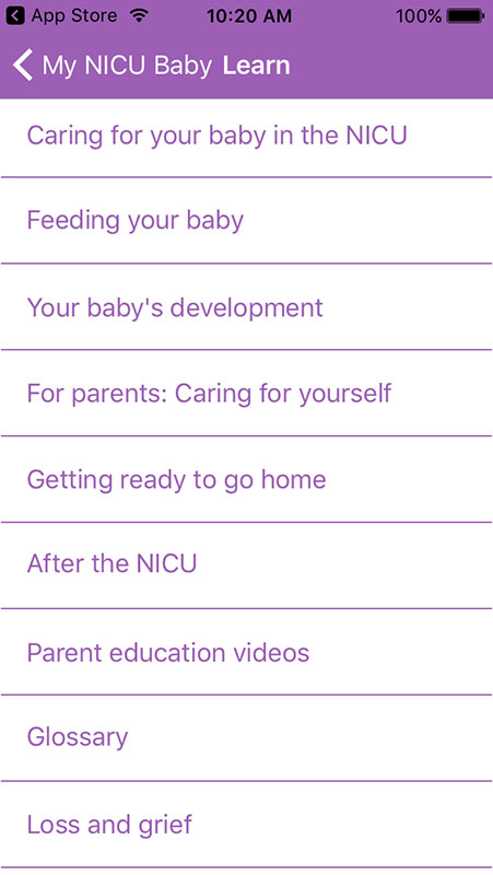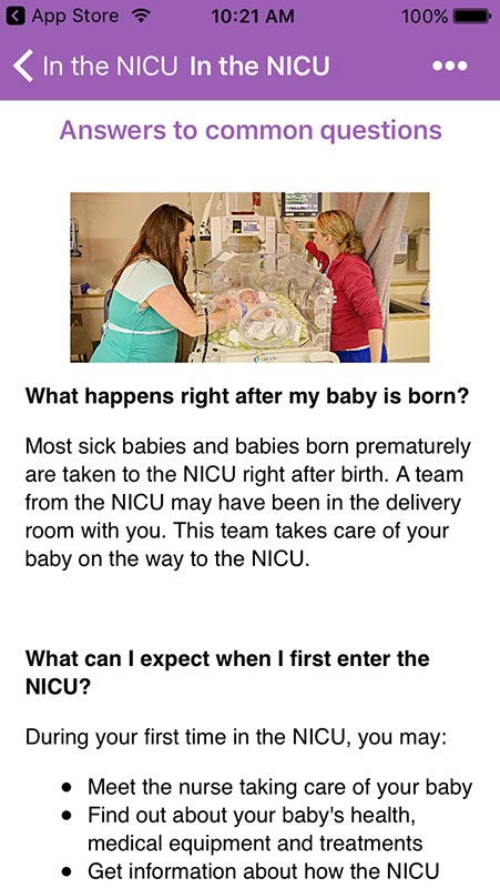 Today's parents rely largely on mobile devices and apps to keep connected and informed. Smartphones and mobile apps can be used to address some of the needs of parents of premature and sick babies by helping them better understand the whole NICU experience.