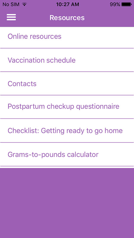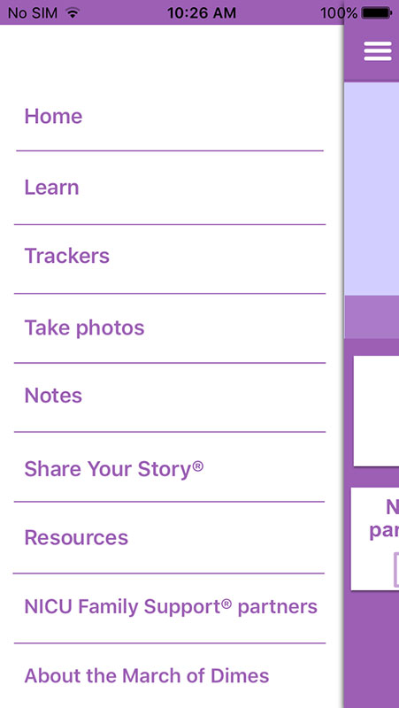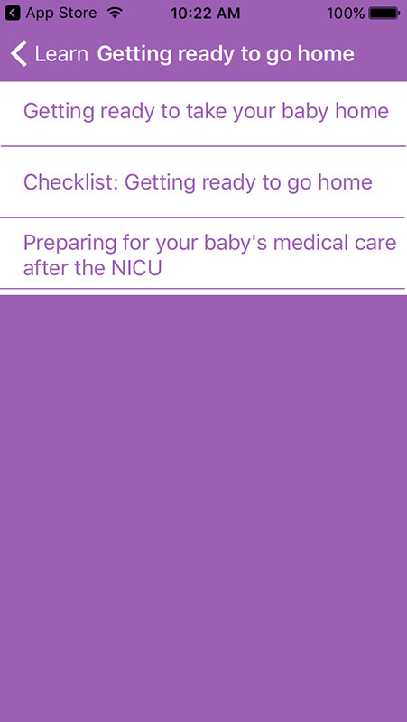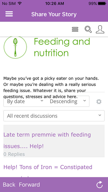 Parents can connect to other NICU parents and families in the discussion boards, which aren't available from the home screen, but you need to tap on the Menu button and then choose 'Share Your Story' section.