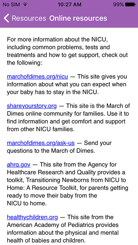 March of Dimes recently released a free app for Android and iPhone called My NICU Baby, which is designed to help parents of premature and sick babies with the experience during the NICU stay and transition home.