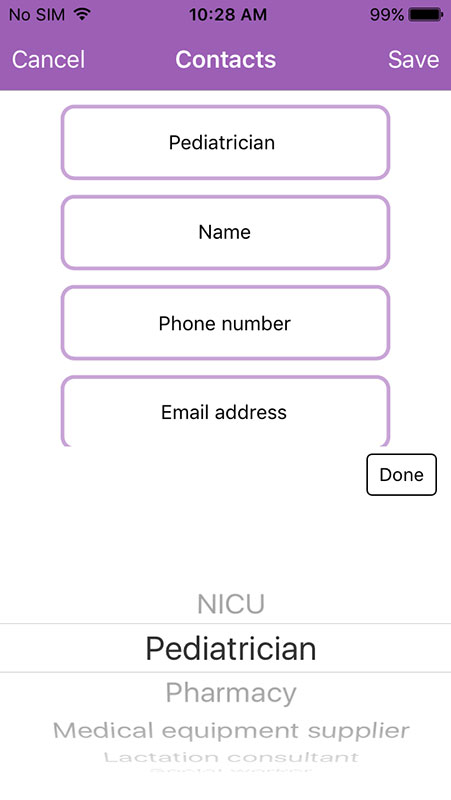 Parents can also add contacts, such as NICU staff, pediatrician, pharmacist, and so on, along with their phone numbers, email, and address.