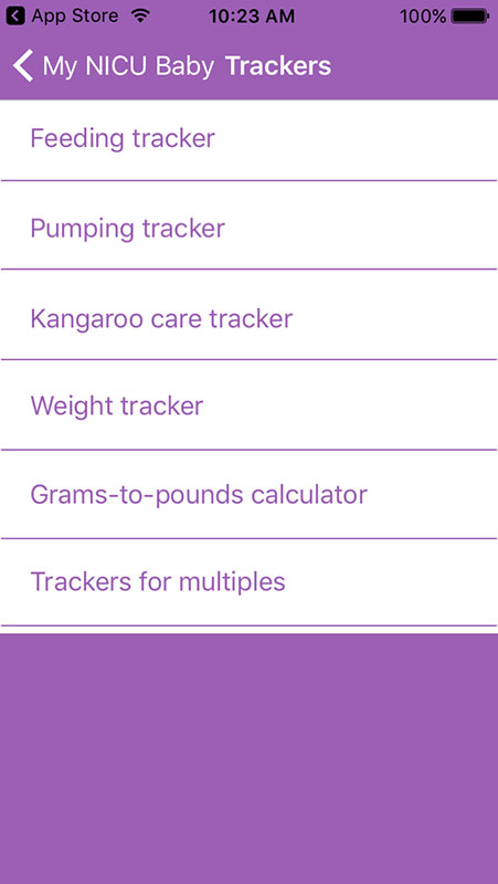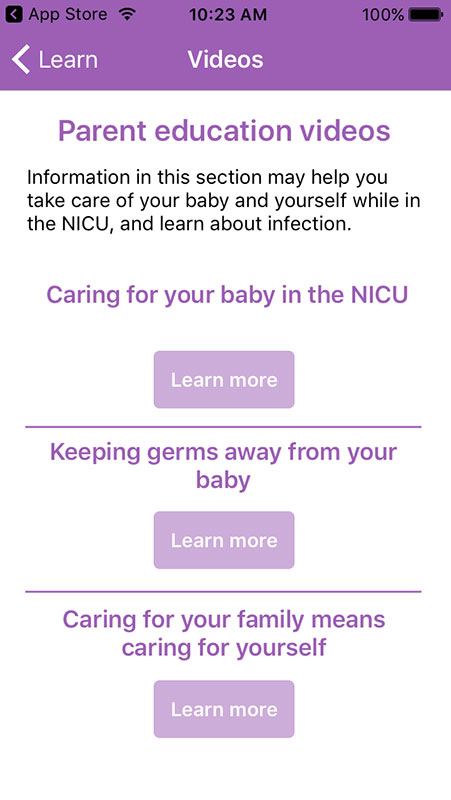 The two most important sections are Learn and Trackers. Learn section provides educational resources, covering various topics from caring for the baby in NICU to development, as well as educational videos for parents covering topics from caring for the baby to caring for themselves.