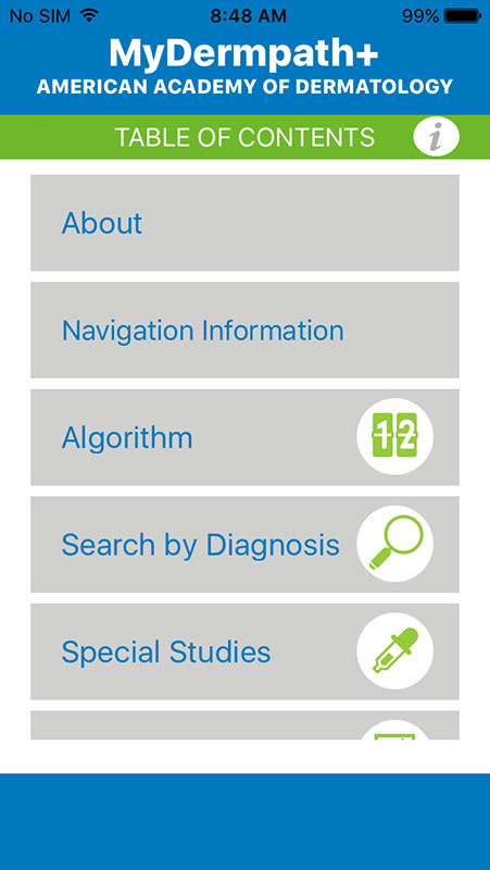 In these sections, users can get more information about the app and the team that created it, the app structure and how to use it, start the standard histology algorithm, search for a specific diagnosis, start the algorithm for special studies, view a glossary of terms, view normal skin histology, or take a quiz.