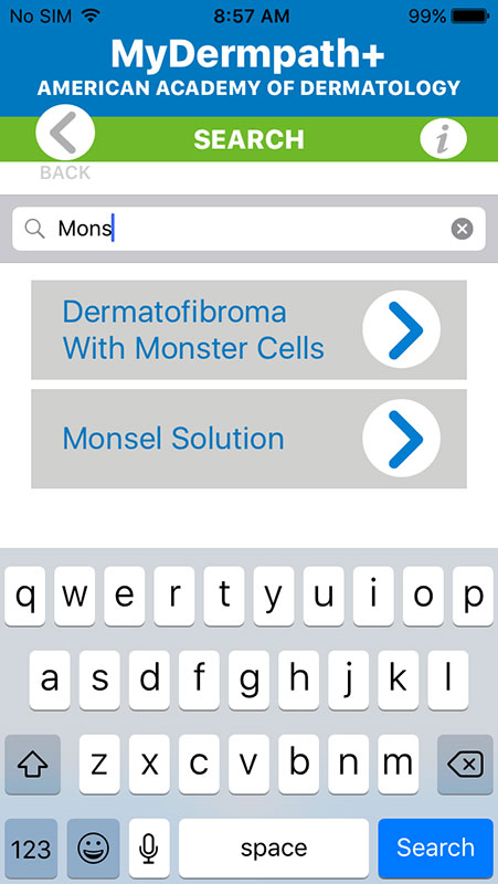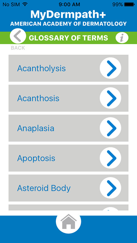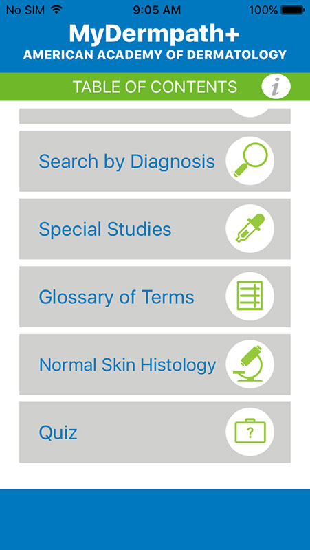 MyDermPath+ app is nicely designed with a blue/white/green color scheme consistent with the AAD's website and their other apps.